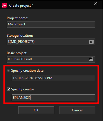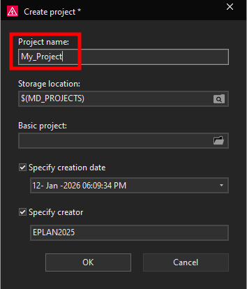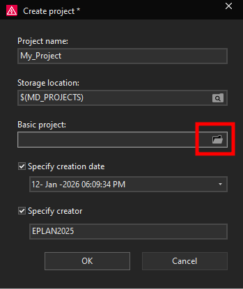 You can change the Storage location for the project however it is recommended to use the storage location according to ePLAN settings. Project storage location as well as the storage locations for other ePLAN files can be defined and changed in the Settings. In this case we will leave the storage location as is defined by default. Next you have the option to select the Basic project, a basic project in ePLAN is a predefined project template that contains default settings, structures, pages, and reports. By default when you install the ePLAN program you have options of choosing between a couple of basic projects.