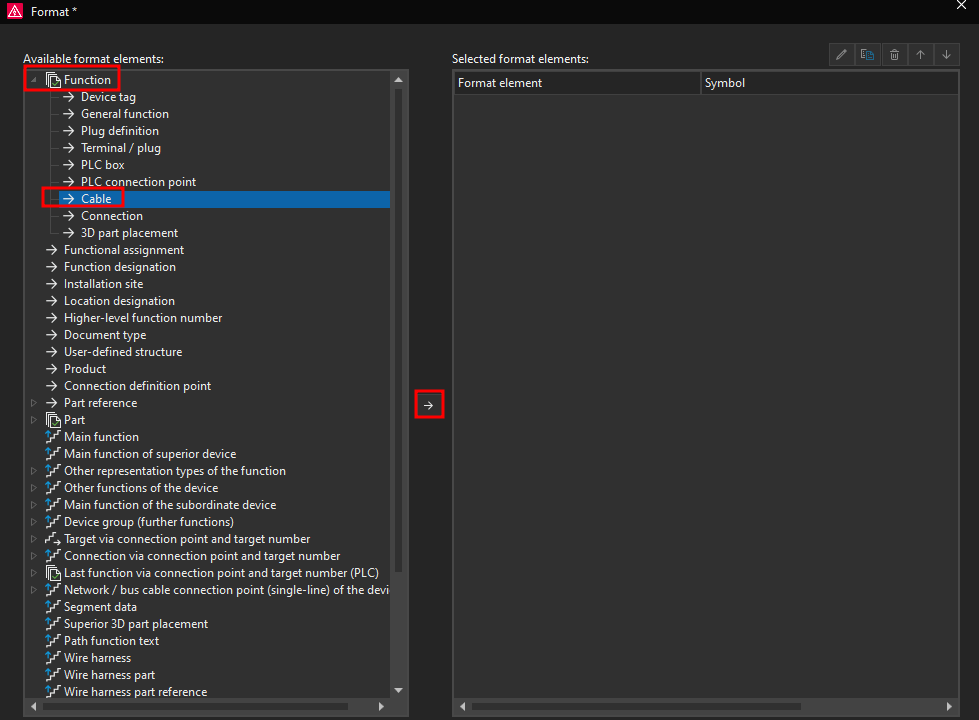 Now the Format window will open, in this window we can define all of the information and the manner in which that information is displayed for this Block property. Since we are creating cable label which displays the cable source and target connections we will start by adding the cable source connection. To add the cable source connection we will click on the Function and then on Cable under the Available format elements: then click on the arrow that is pointing to the right side in the middle of the window.