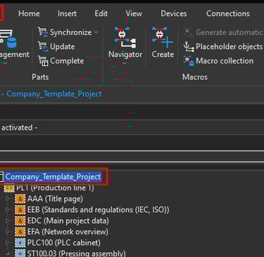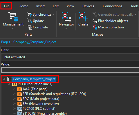 In order to create the cable label Block property first we have to define the Block property Format. Click on the project name in the page navigator in this case this is the Company_Template_Project then in the top left corner click on File ribbon.