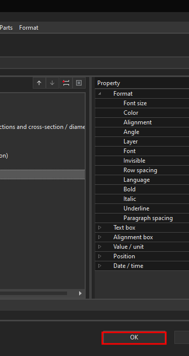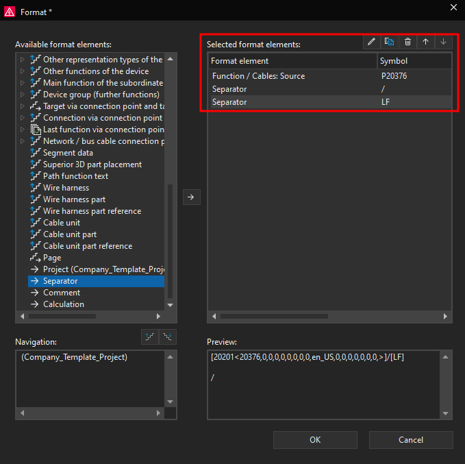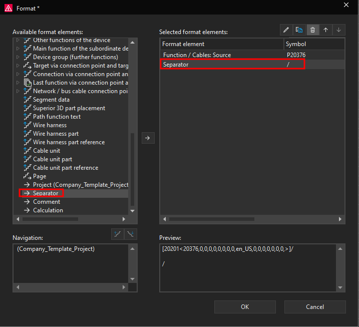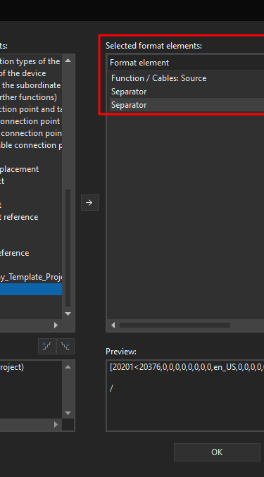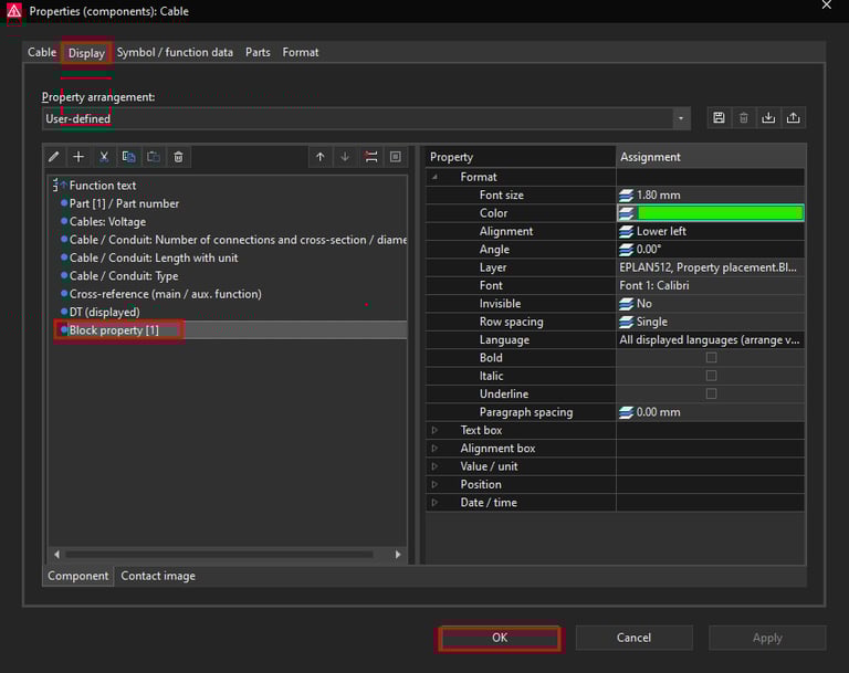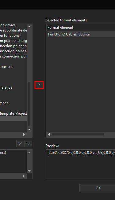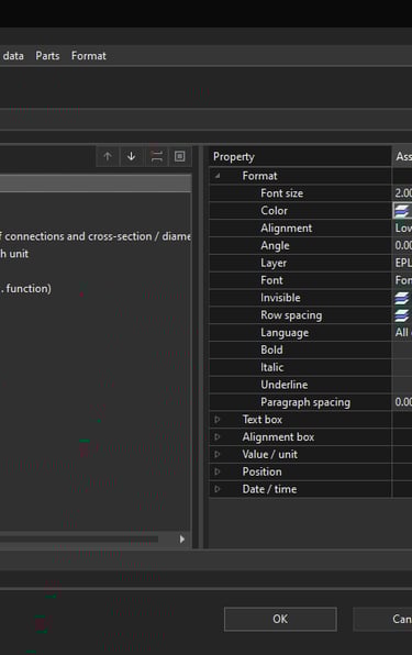 Now we have selected all of the necessary format elements which are required to create the cable label and designation according to cable source and cable target connection designations. To apply the changes and close the Format window by clicking on the OK button.