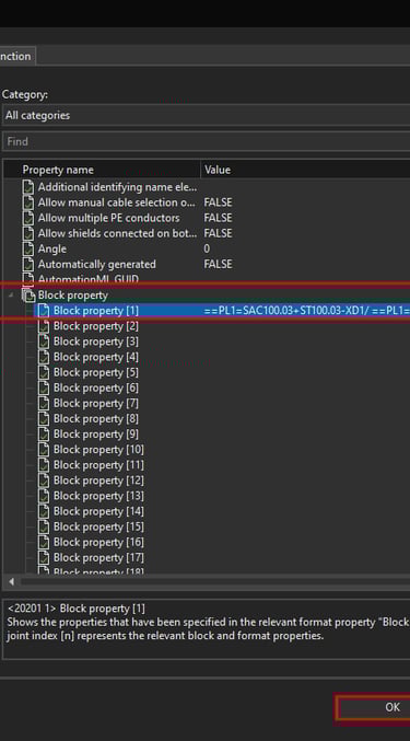 Search for Block property: Format (cable / shield) and then open that property group and then click on the Block property: Format (cable / shield) [1] and then click on the OK button to add that property under the Property categories.