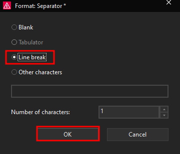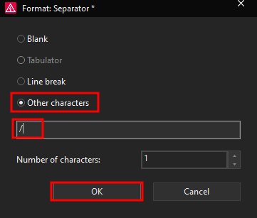 Now a Format: Separator window will open, here we have options to select Blank space as a Separator or to use Line break. However since we want to add / character we will select Other characters. In the row below we will enter the character which we want to use as a Separator which in this case is /.