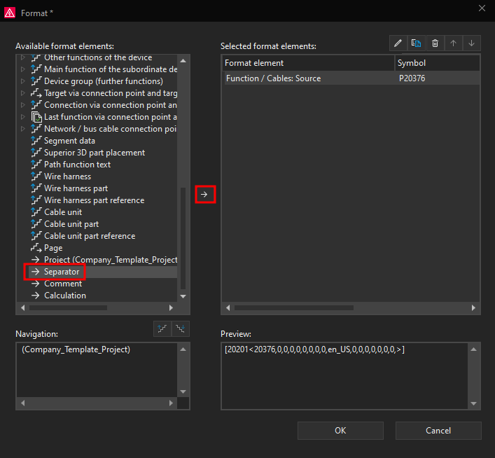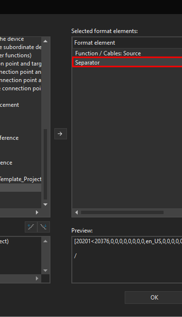 We will add a separator character / in the cable source row. In order to do that we have to add a Separator character, in the Format window click on the Separator and then click on the arrow pointing to the right side.