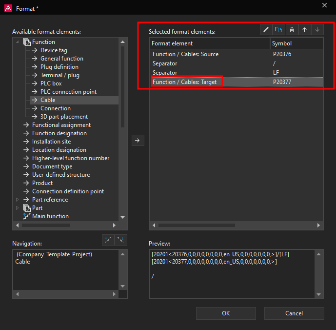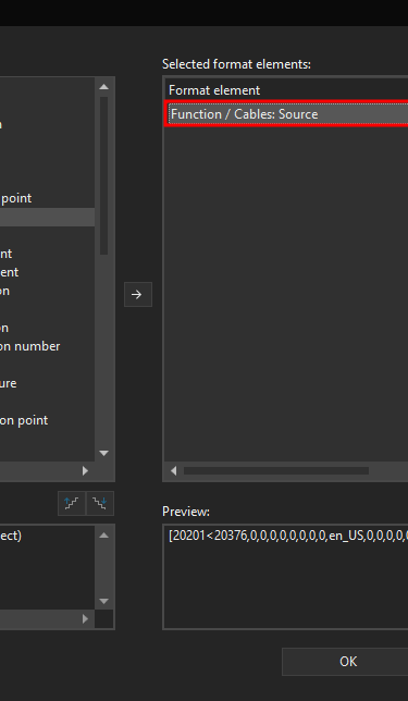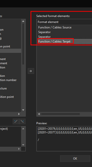 Now we still need to add the cable target, we will add the cable target in same way we added the cable source. Click Cable below the Function format element and add the Function / Cables: Target to the Selected format elements:.