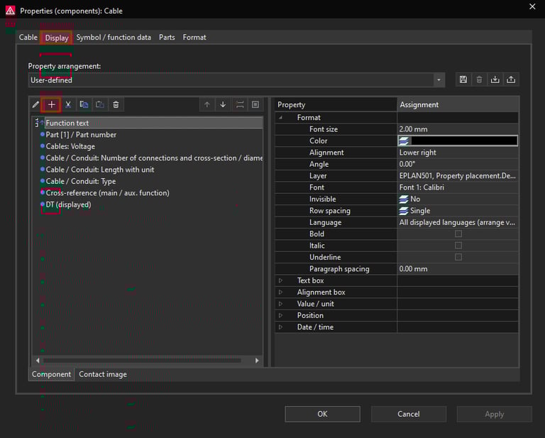 Once we open the cable properties we will go to the Display tab. We will add a new property to be displayed by clicking on the plus icon.