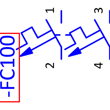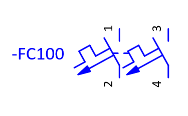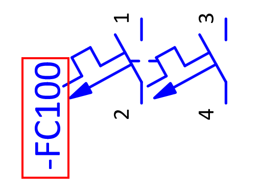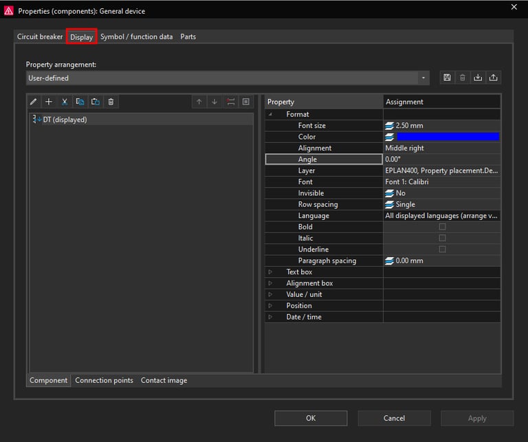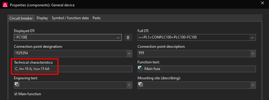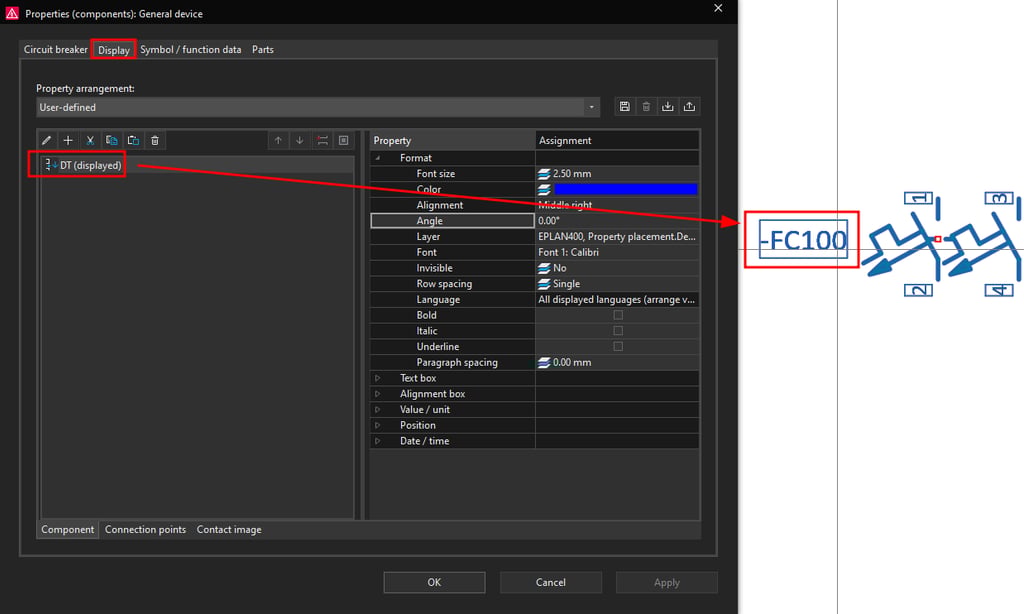 Currently in the Display tab we only have the DT (displayed) property set to be displayed. This is the circuit breaker designation in this case -FC100 which can be seen next to the circuit breaker symbol.