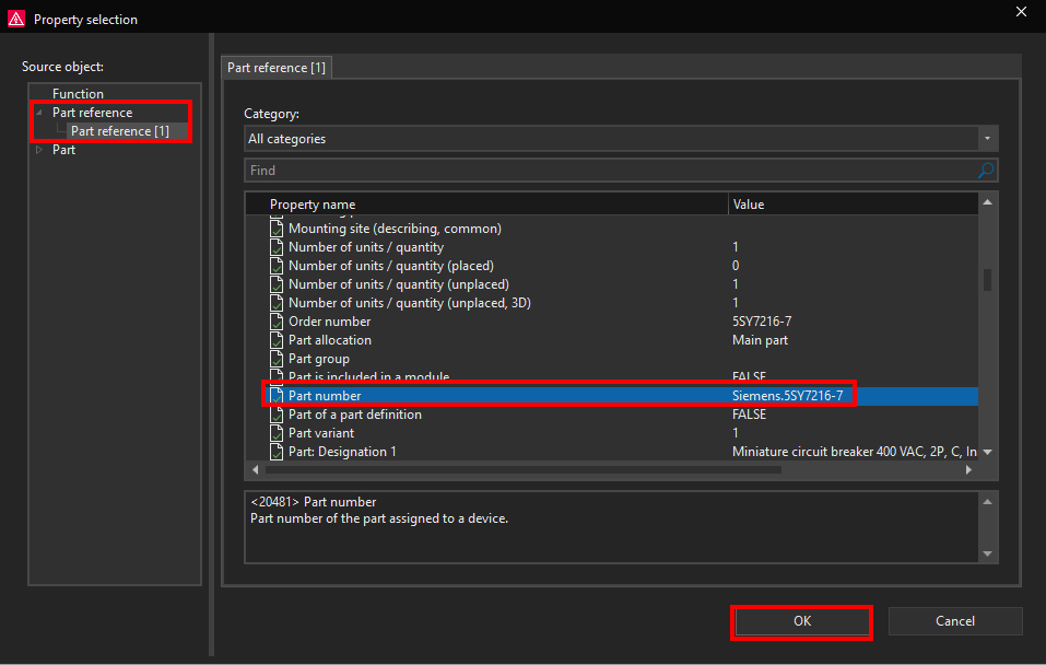 Now we will add the Part number property from the Part reference-Part reference [1] Function. Then we will click on the OK button.