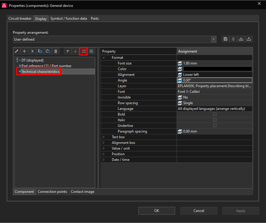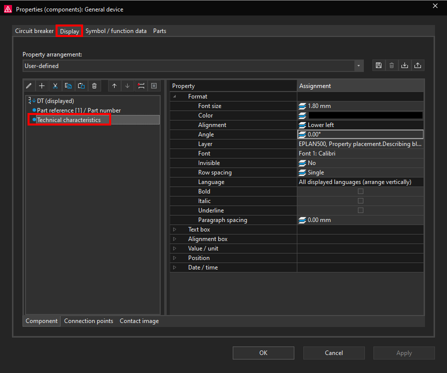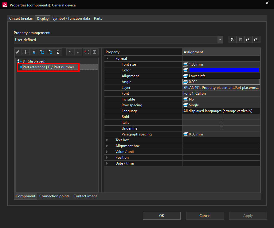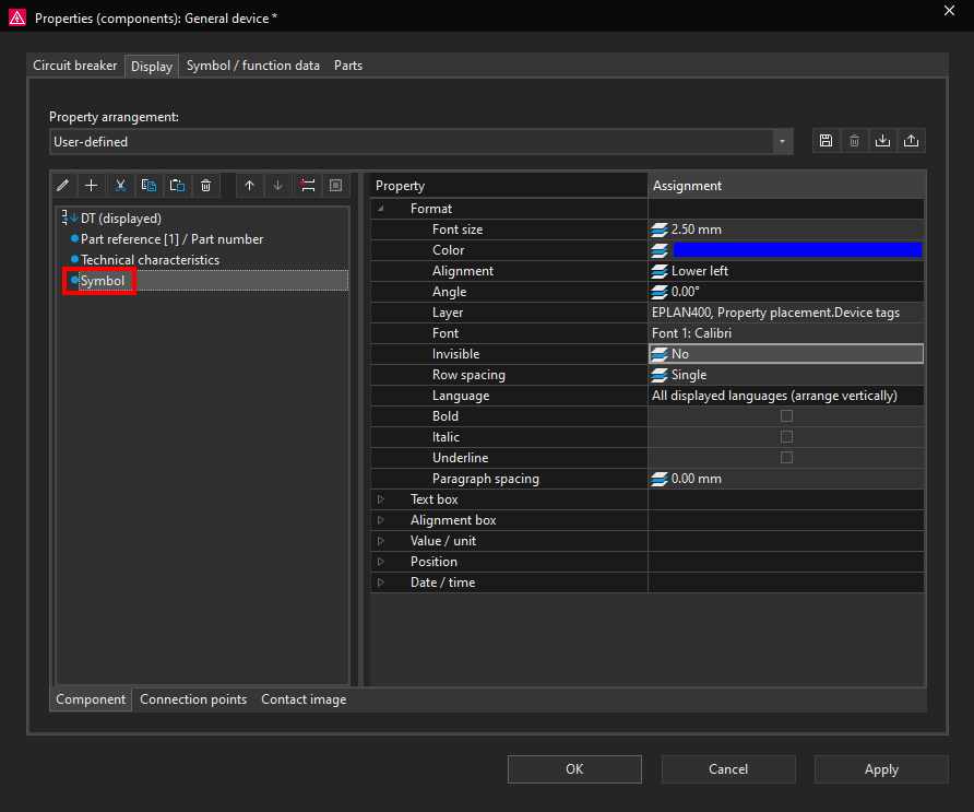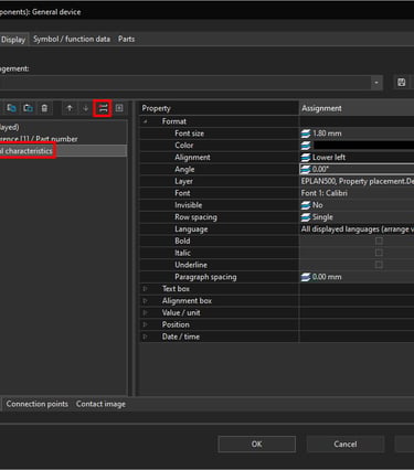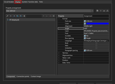 Display property arrangements in ePLAN define how object properties are visually presented in the schematic or graphical editor. They control the position, visibility, formatting, and appearance of property texts associated with symbols, devices, and other objects. They affect only the graphical display, not the technical or logical data of the project.