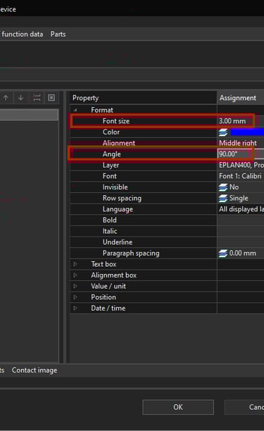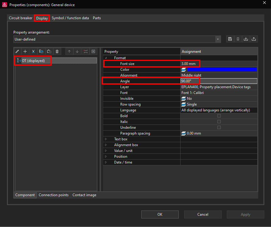Click on the Apply button to apply the changes and then click om the OK button to close the Properties window. Now notice how the font got bigger and the angle changed to 90 ° for the circuit breaker DT (displayed) property.