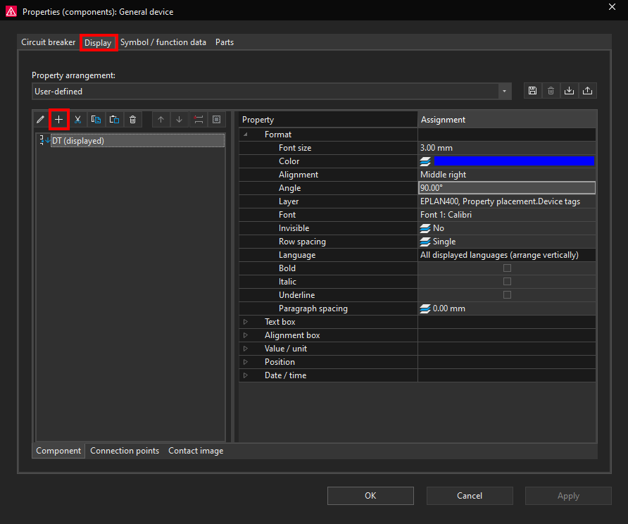 Now we will open the circuit breaker properties window again and go back to the Display tab. We will add the circuit breaker part number to be displayed. To add a new property to be displayed click on the plus icon in the Display tab.