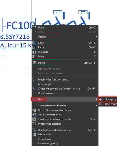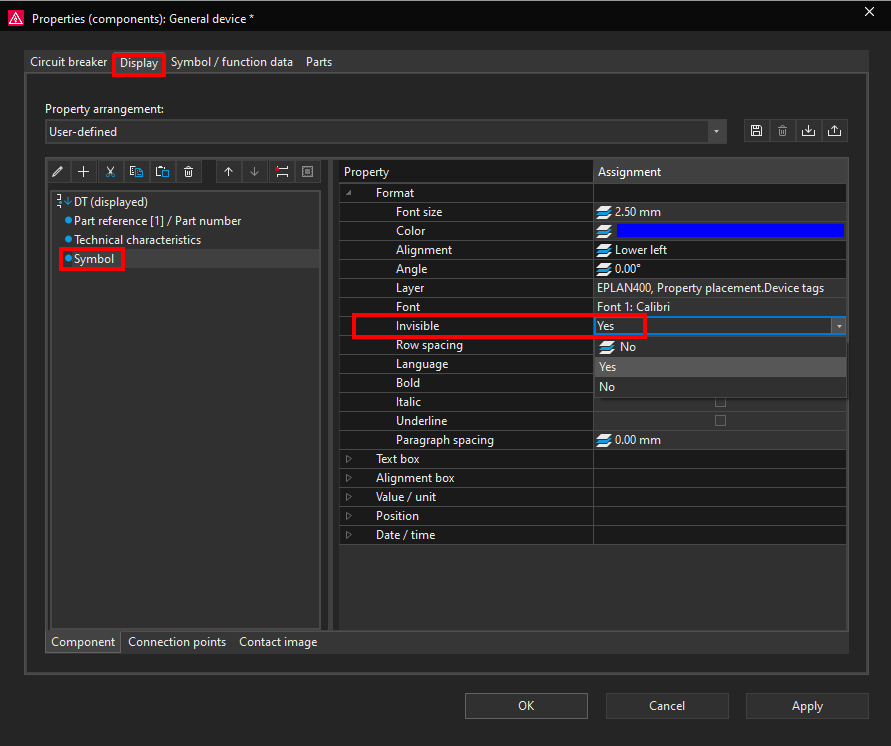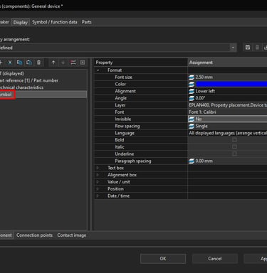 You can also display a property which can be seen while you are working in ePLAN but it is invisible and will not be printed or exported to PDF. To demonstrate this we will add the circuit breaker Symbol name property to be displayed.