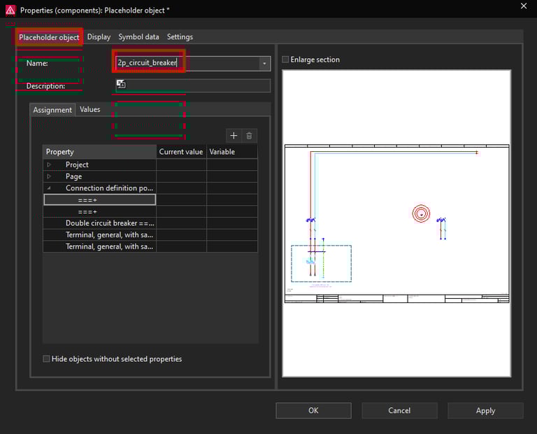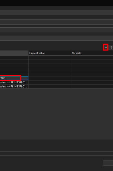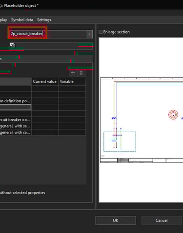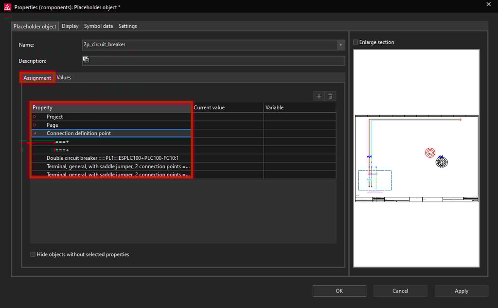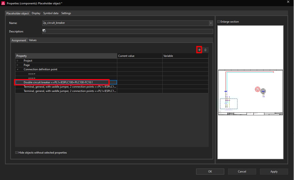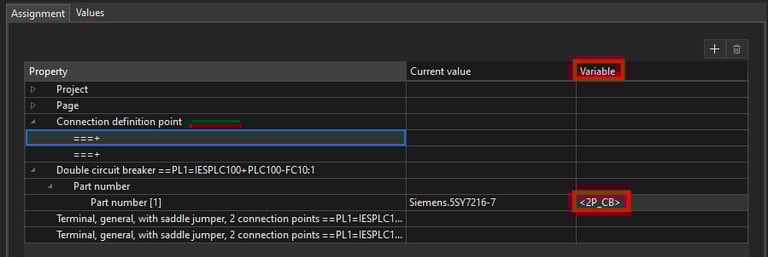 Now we will assign a variable on the Double circuit breaker symbol to be able to change the part number according to the rated current. Select the Double circuit breaker ==PL1=IESPLC100+PLC100-FC10:1 property and then click on the plus icon at the top right.