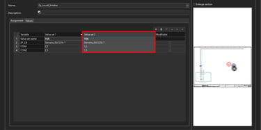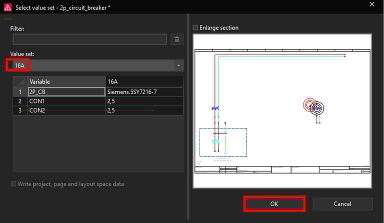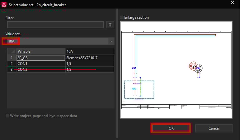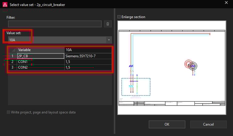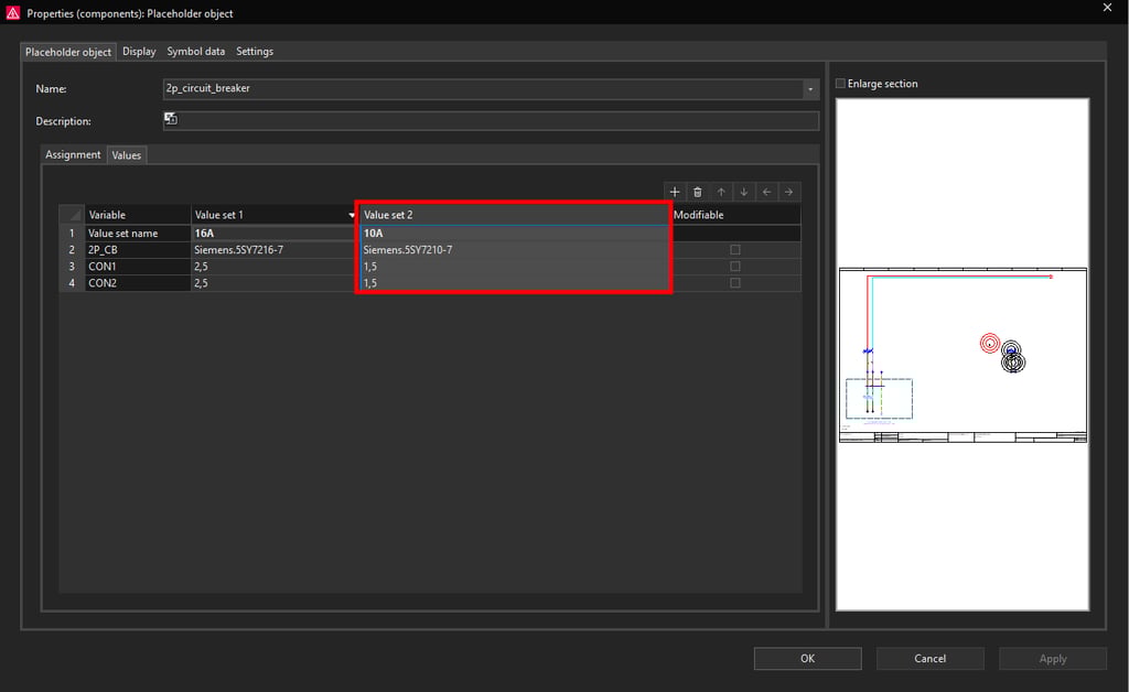 In the same way we will create another value set for 10A rated current. Since this value set will be used for 10A rated current we will assign the Siemens circuit breaker part number which has the rated current 10A. Also for the wire cross section we will write in 1,5 mm² cross-section. When you are finished with setting up the placeholder values click on the OK button.