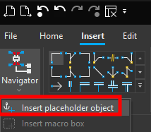 To insert a placeholder object click on the Insert ribbon and then click on the small arrow under the macro navigator and then click on Insert placeholder object.