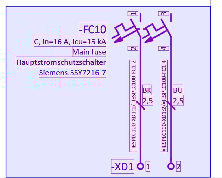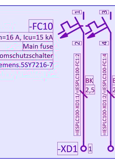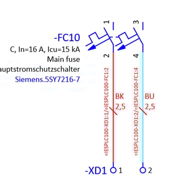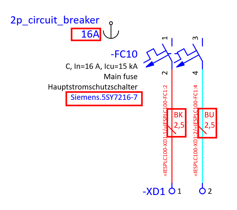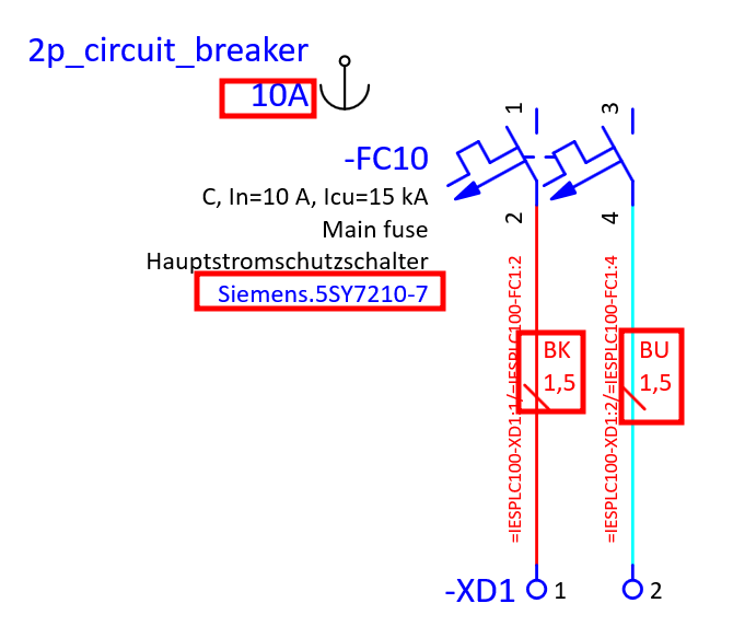 In this example we have a 2 pole circuit breaker which is connected with 2 wires 2,5 mm² cross-section to the terminals. We will use this example to demonstrate the functionality of placeholder objects. We will create 2 value sets within the placeholder object one for 10A rated current and another for 20A rated current. With these 2 value sets we will change the 2 pole circuit breaker part numbers according to the rated current and we will also change the wire cross-section.