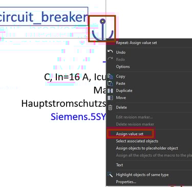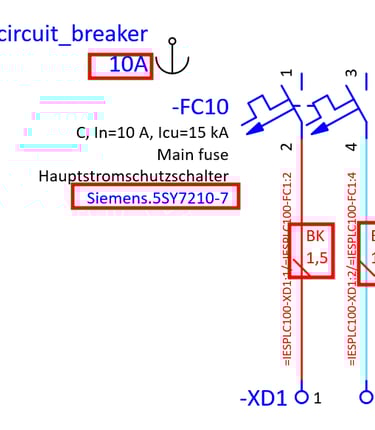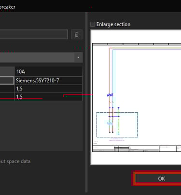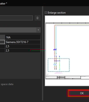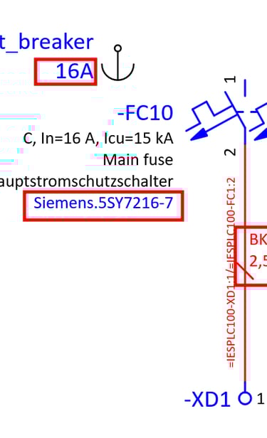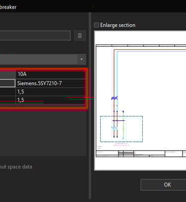 If the placeholder object was configured correctly the part number of the circuit breaker should change and also the wire cross-section should change from 2,5 mm² cross-section to 1,5 mm² cross-section.