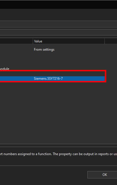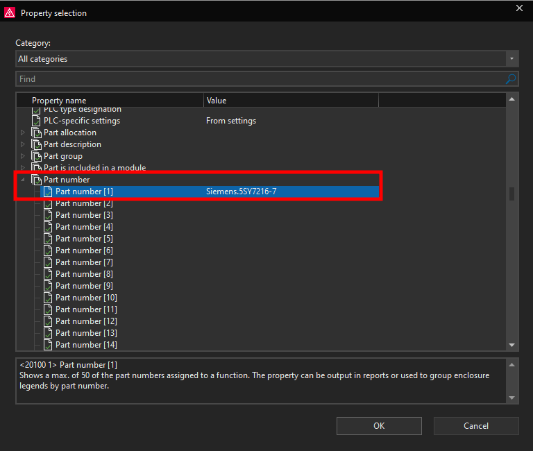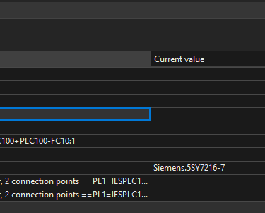 Now we will select the Part number [1] property, you can see the current value for this property is currently set to Siemens.5SY7216-7 which is the current part number of the circuit breaker.
