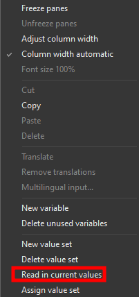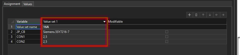 We can give the new value set a name in this case 16A according to the rated current. For this value set we want to take the existing values from the circuit diagram. We can do this by right clicking on the 16A value set and then clicking on the Read in current values command.