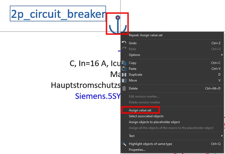 Now we can test the placeholder object by right clicking on the placeholder object anchor symbol and then clicking on the Assign value set command.